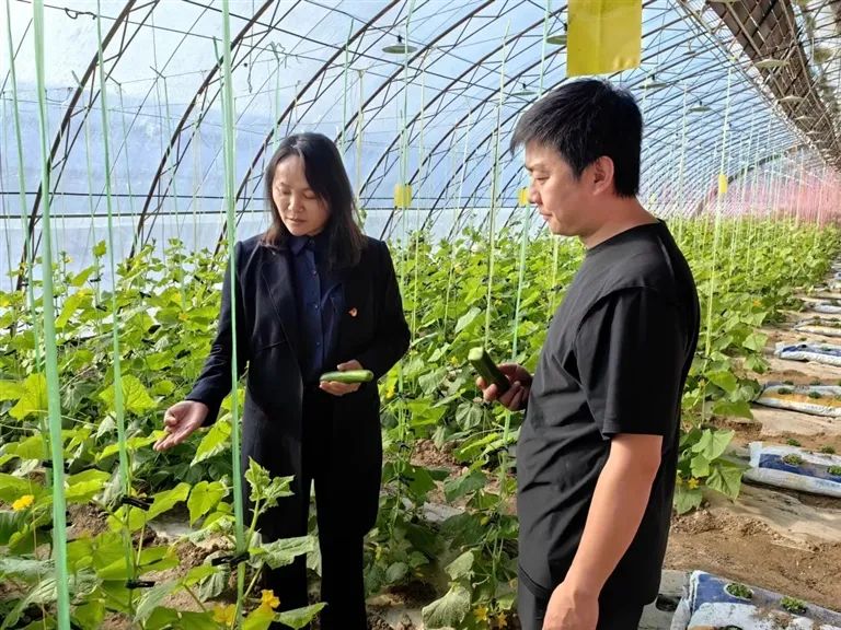 在中國農(nóng)科院西部農(nóng)業(yè)研究中心溫室基地,中國農(nóng)科院西部農(nóng)業(yè)研究中心綠洲節(jié)水與戈壁生態(tài)農(nóng)業(yè)創(chuàng)新團隊執(zhí)行首席、研究員馬月虹(左)和甘肅瑞盈熱力有限公司市場經(jīng)理夏亮探討黃瓜種植技術(shù)?! 醣緢笥浾?王 薇攝