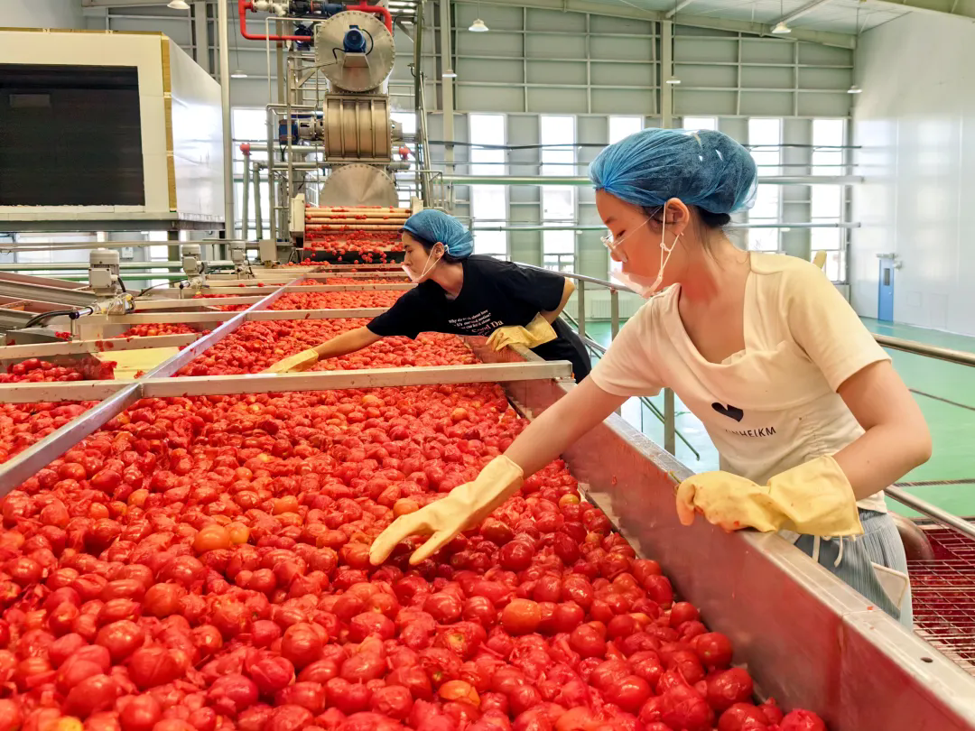 新茄食品建有11條生產(chǎn)線,日處理番茄10000噸,年產(chǎn)能20萬噸?!捌髽I(yè)8月6日正式開機,預(yù)計生產(chǎn)期55天?!毙虑咽称房偨?jīng)理助理安利介紹,為契合市場需求,企業(yè)每年拿出3%的營業(yè)收入投入研發(fā),已成功推出有機番茄塊、番茄醬、大果粒番茄汁等36個產(chǎn)品。