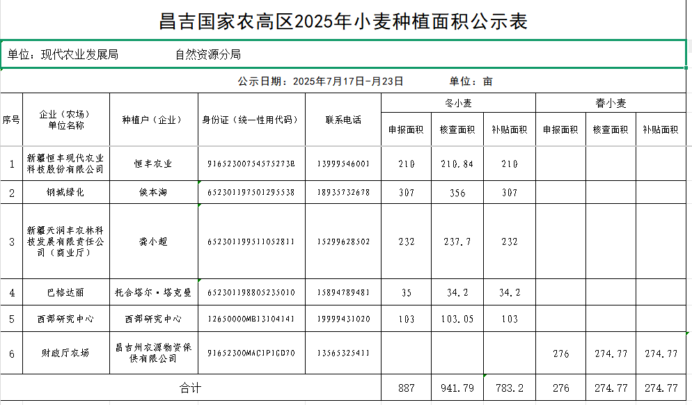 昌吉國家農(nóng)高區(qū)2025年小麥種植面積公示表